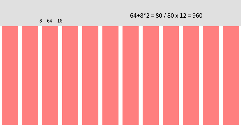 디자인을 시작한 지 몇 년 되지 않는 분들에겐 생소한 수치입니다. 과거 1024 해상도에 대응하기 위해 탄생한 320 해상도의 3 배수인 960입니다. 이걸 설명하는 이유는 바로 960(980)을 통해 우리가 지금까지 쓰고 있는 12컬럼 그리드 시스템이 대중화되었기 때문입니다. 디자인을 오래 하셨다면 기억이 나실 겁니다. '960 Grid system' 국내외 많은 디자이너들이 웹 그리드 시스템을 알게 된 계기이며, 이때를 전후로 실무에 깊숙하게 전파되었습니다. 여기서 탄생한 12컬럼이 지금까지도 이어져 웹페이지의 단을 나누는 기준이 되었습니다.