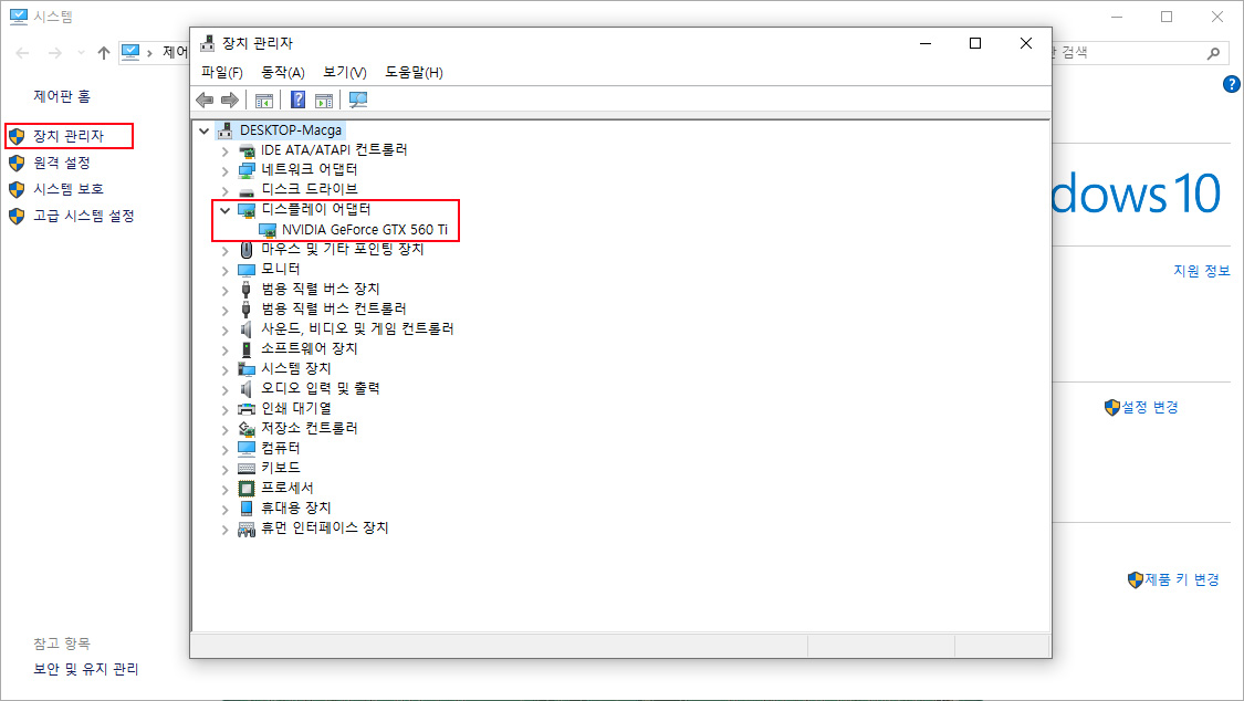 - 윈도우 바탕화면에서 '내컴퓨터' 아이콘 우클릭, '속성'을 누르면 위와 같은 창이 뜹니다.