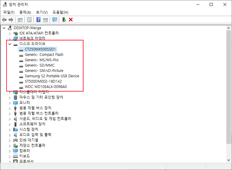 하드디스크는 또한 위 사양 체크하듯 장치 관리자에서 확인할 수 있지만 초심자가 체크하기 많이 어렵습니다. 모델명으로 적혀있어서 각 사양을 정확하게 파악하기 쉽지 않고 장치 관리자를 통해 그것이 SSD인지 일반 HDD인지 알 수 없습니다. 초심자를 위한 설명이니 위 같이 모델명이 나온다면 해당 모델명을 검색해서 확인해보세요. 추가로 하드디스크를 구매하는 목적이라면 먼저 PC의 본체 내부를 확인해야 합니다.